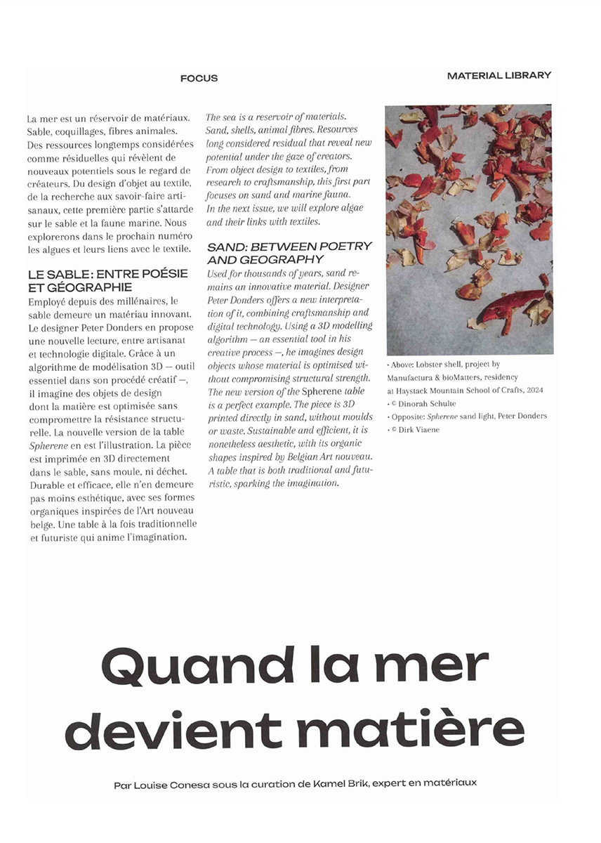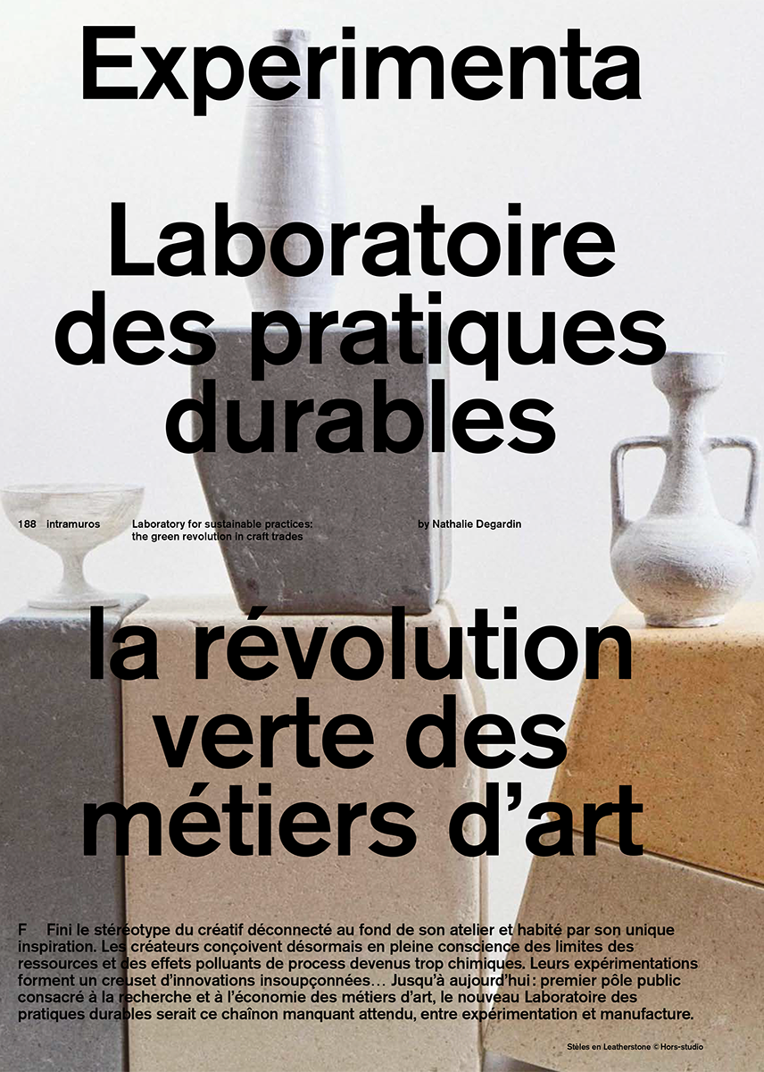 La transformation de ces « ressources déchets », s’opèrent par la maîtrise des techniques artisanales combinées aux nouvelles technologies, avec des chutes récupérées, broyées et micronisées, leur permettant d’aboutir des nouveaux matériaux, objets et scénographies.