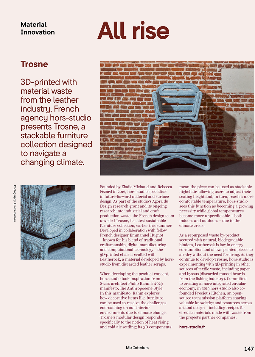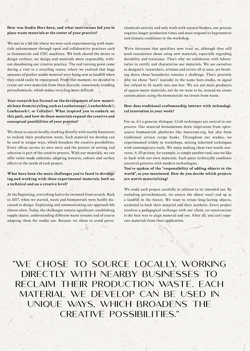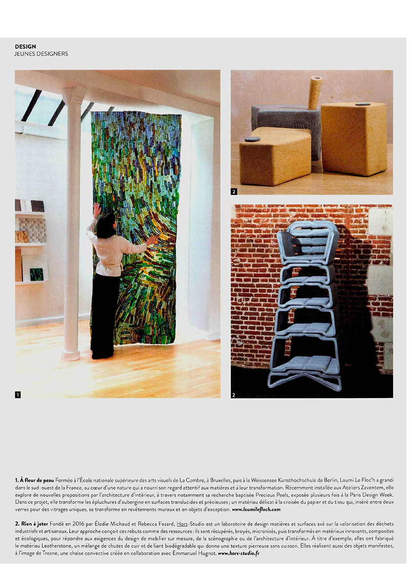 Fondé par Elodie Michaud et Rebecca Fezard en 2016, hors-studio est spécialisé en design matières et surfaces. hors-studio mène un travail de recherche & développement par le design, sur la valorisation des chutes et déchets de production industrielles et artisanales.