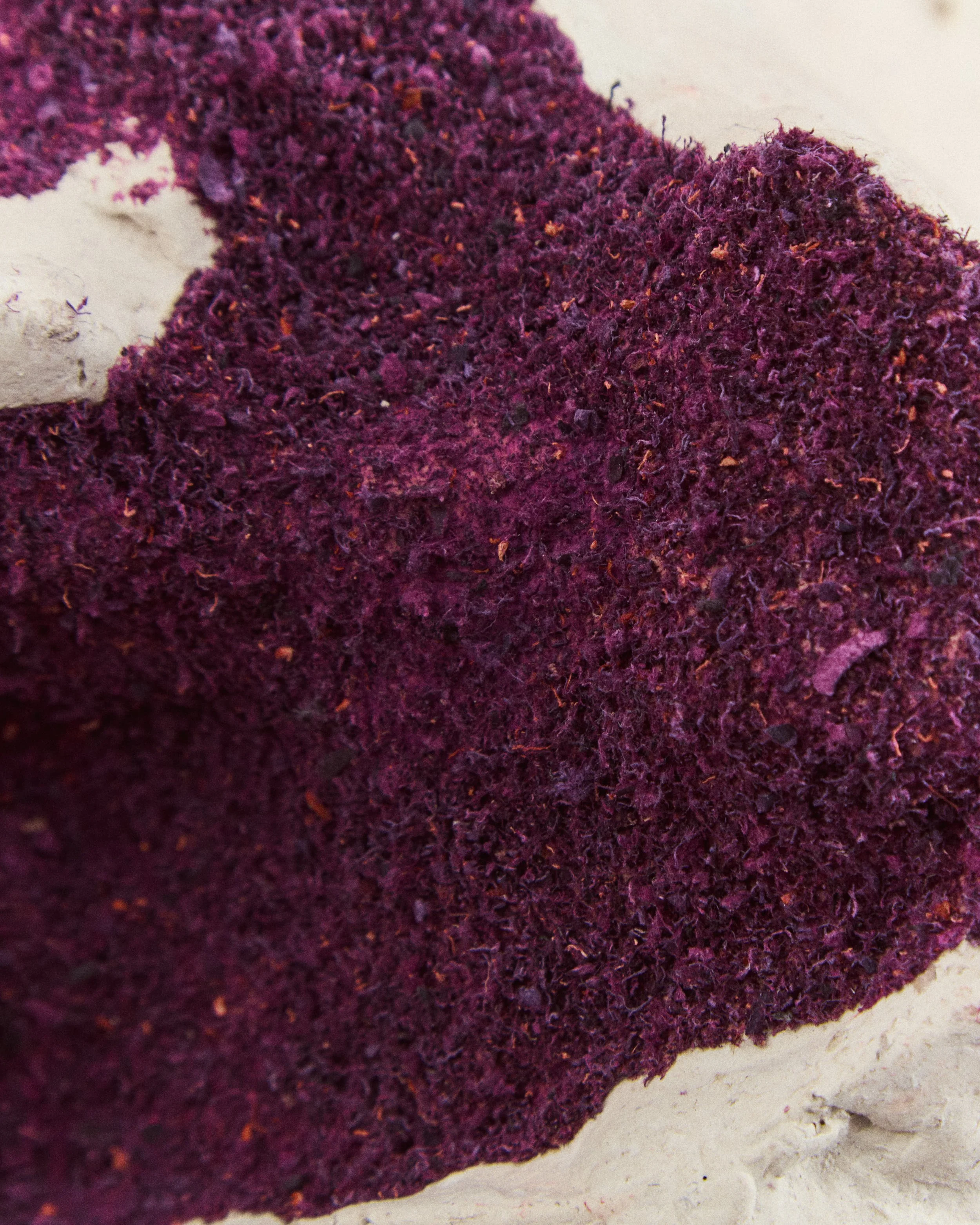 Marteler, tailler, sculpter, flocker… Chaque geste dessine une topographie de surface et un terrain de différentes textures. La matière faite de rebuts s’offre ici comme une roche contemporaine, un minéral anthropocène où les strates racontent les gestes et les territoires.